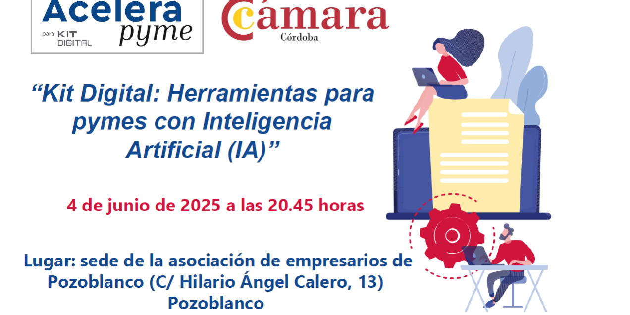 La oficina Acelera pyme de la Cámara de Comercio de Córdoba, puesta en marcha en colaboración con la entidad pública Red.es y cofinanciada por los fondos europeos Next Generation EU del Plan de Recuperación, organiza junto con la asociación de empresarios de Pozoblanco el próximo 4 de junio a las 20.45 horas en la sede de la asociación (C/ Hilario Ángel Calero, 13 de Pozoblanco) el taller “Kit Digital: Herramientas para pymes con Inteligencia Artificial (IA)».