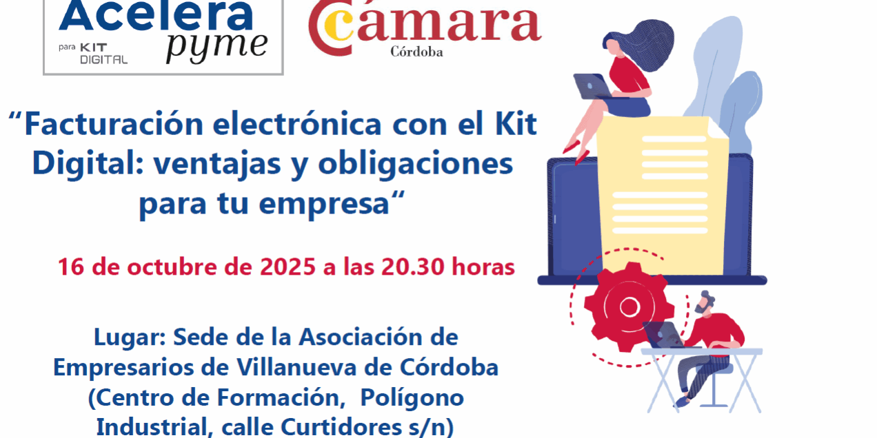 La oficina Acelera pyme de la Cámara de Comercio de Córdoba, puesta en marcha en colaboración con la entidad pública Red.es y cofinanciada por el Plan de Recuperación, Transformación y Resiliencia a través de los fondos NextGenerationEU en el marco de la agenda España Digital 2026 y el Plan de Digitalización de Pymes 2021-2025, organiza junto con la asociación de empresarios de Villanueva de Córdoba el próximo 16 de octubre a las 20.30 horas en la sede de la asociación (Centro de Formación, Polígono Industrial, calle Curtidores s/n de Villanueva de Córdoba) el taller “Facturación electrónica con el Kit Digital: Ventajas y obligaciones para tu empresa” .