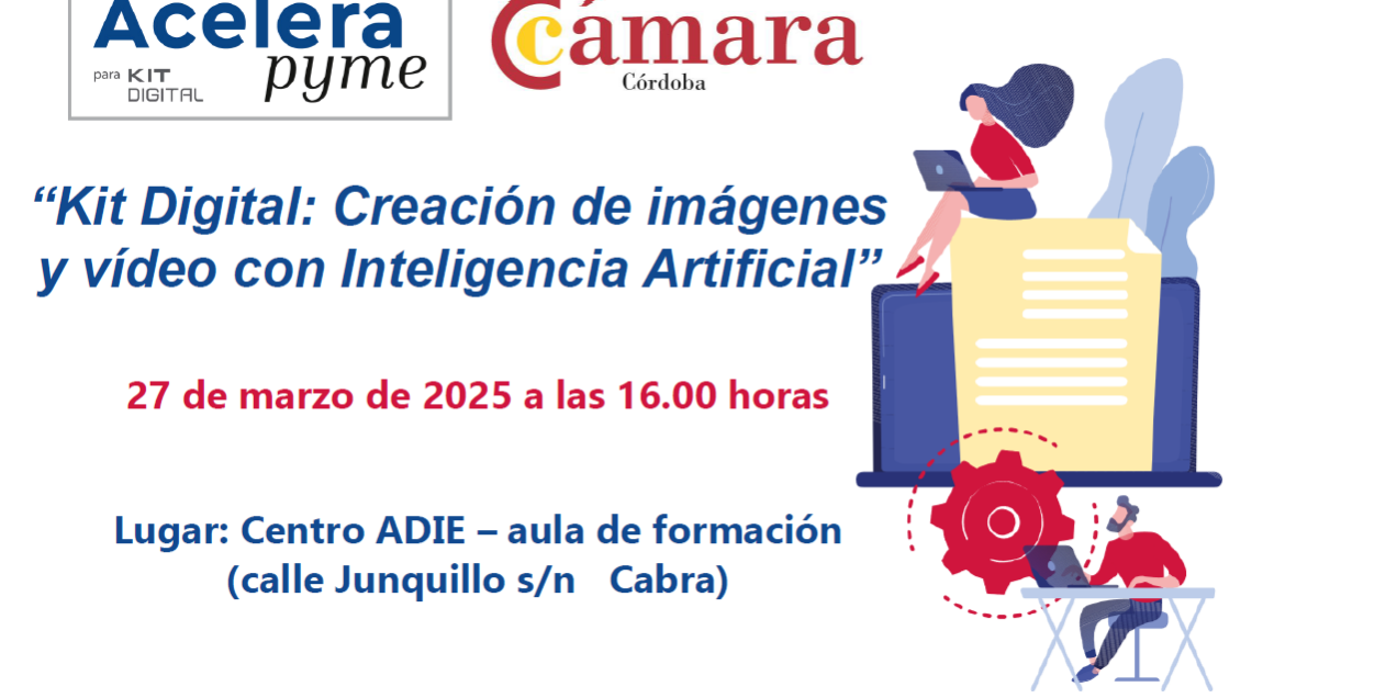 La oficina Acelera pyme de la Cámara de Comercio de Córdoba, puesta en marcha en colaboración con la entidad pública Red.es y cofinanciada por los fondos europeos Next Generation EU del Plan de Recuperación, organiza junto con la asociación de empresarios y comerciantes de Cabra (AECA) el próximo 27 de marzo a las 16.00 horas en el aula de formación del centro A.D.I.E. (C/ Junquillo s/n Cabra) el taller “Kit Digital: Creación de imágenes y vídeo con Inteligencia Artificial”.
