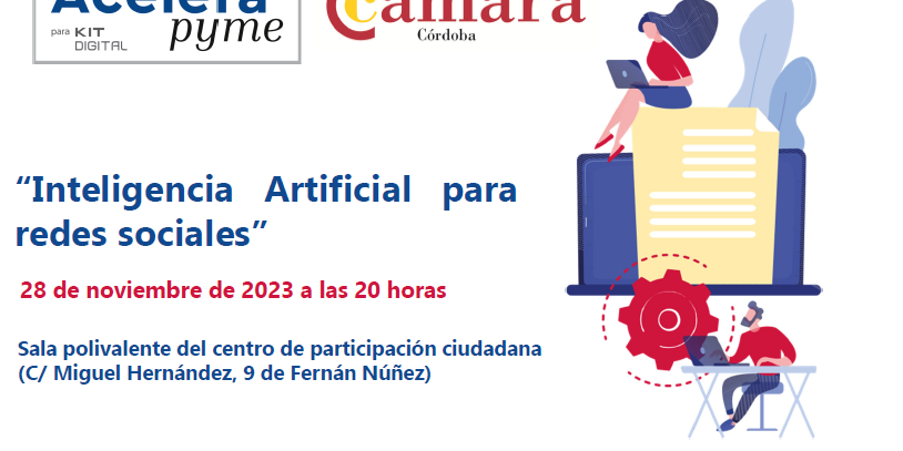 La oficina Acelera pyme de la Cámara de Comercio de Córdoba, puesta en marcha en colaboración con la entidad pública Red.es y cofinanciada por los fondos europeos Next Generation EU del Plan de Recuperación, organiza junto con la asociación de empresarios y autónomos de Fernán Núñez el próximo 28 de noviembre a las 20.00 horas en la sala polivalente del centro de participación ciudadana (C/ Miguel Hernández, 9 de Fernán Núñez) el taller “Inteligencia Artificial para redes sociales”.