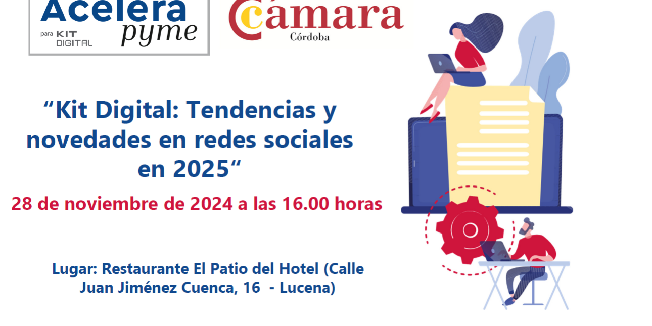 La oficina Acelera pyme de la Cámara de Comercio de Córdoba, puesta en marcha en colaboración con la entidad pública Red.es y cofinanciada por los fondos europeos Next Generation EU del Plan de Recuperación, organiza junto con el Centro Comercial Abierto Eliossana de Lucena el próximo 28 de noviembre a las 16.00 horas en el restaurante El Patio del Hotel (Calle Juan Jiménez Cuenca, 16 – Lucena) el taller «Kit Digital: Tendencias y novedades en redes sociales en 2025“.