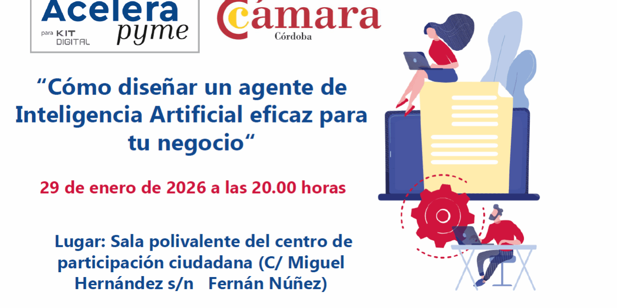 La oficina Acelera pyme de la Cámara de Comercio de Córdoba, puesta en marcha en colaboración con la entidad pública Red.es y cofinanciada por los fondos europeos Next Generation EU del Plan de Recuperación, organiza junto con la asociación de empresarios y autónomos de Fernán Núñez el próximo 29 de enero a las 20.00 horas en la sala polivalente del centro de participación ciudadana (C/ Miguel Hernández, 9 de Fernán Núñez) el taller «Cómo diseñar un agente de Inteligencia Artificial eficaz para tu negocio».